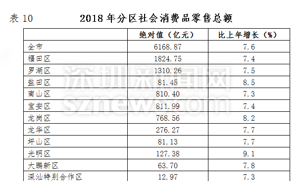 2018年,深圳全市社会消费品零售总额6168.87亿元,比上年增长7.6%。按消费类型分,商品零售额5424.38亿元,增长7.4%;餐饮收入额744.49亿元,增长8.4%。