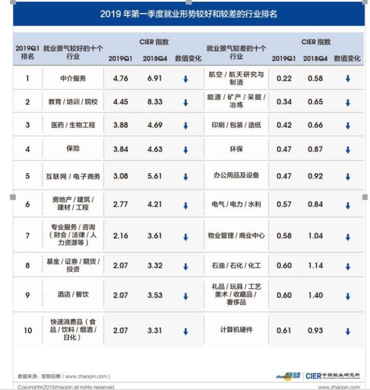 4月20日,智联招聘发布2019年第一季度《中国就业市场景气报告》。报告显示,一季度就业景气指数呈季节性下降,为1.68。本季度,教育 /培训 /院校的招聘需求出现逆市上升,而金融业招聘职位数降幅在所有行业中最大。