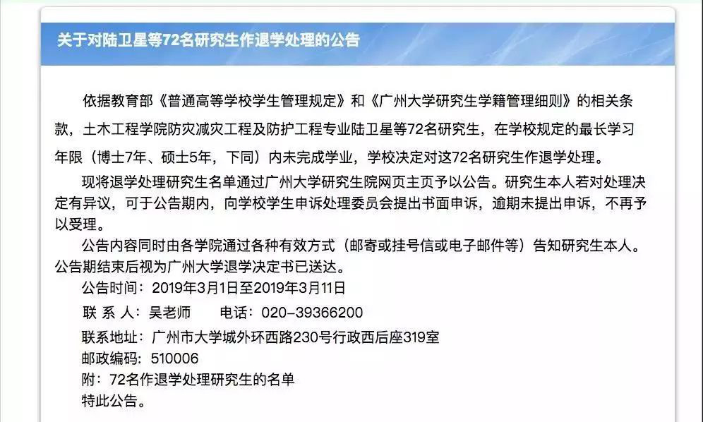 72名研究生在学校规定的最长学习年限(博士7年、硕士5年,下同)内未完成学业,学校决定对这72名研究生作退学处理。