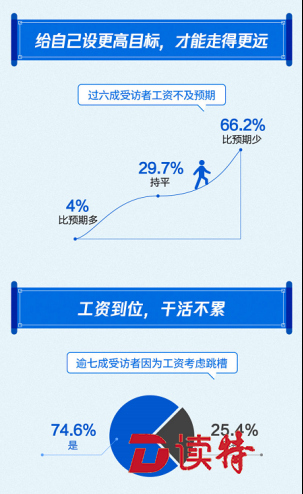 报告显示,受经济环境等因素影响,过六成受访者工资不及预期,同时,工资水平影响了职场人的职业规划,逾七成受访者因为工资考虑跳槽;66.2%的受访者工资水平比预期少,只有4%的受访者认为工资比预期多,此外,逾七成受访者认为工资是考虑跳槽的主要因素。