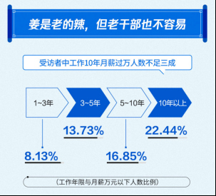 此外,受访者月薪过万人数与随着工作年限递增,但工作10年月薪高于1万的人数依然不足三成。报告显示,工作10年以上的受访者中月薪过万人数比例为22.44%、工作5-10年月薪过万人数比例为16.85%、工作3-5年月薪过万人数比例为13.73%、而工作1-3年月薪过万人数比例是8.13%。这也从侧面说明了工作经验不是影响工资水平的唯一因素,想要得到高薪,经济环境、工作地域、从事行业等因素也至关重要。