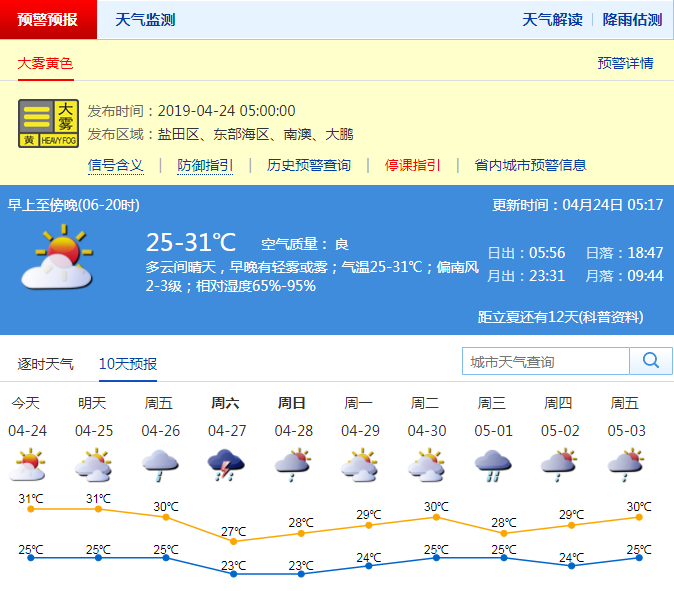 深圳新闻网2019年4月24日讯 深圳市气象局预计24日多云,中午前后闷热,早晚有轻雾或雾,气温25-31℃;25-26日多云,局地有短时阵雨或雷阵雨;26日夜间至28日有一次雷雨过程,局地有大到暴雨。