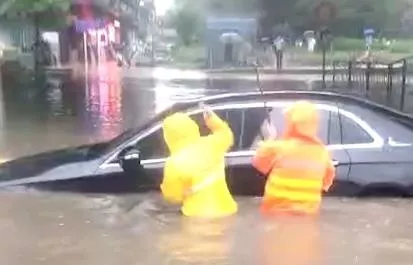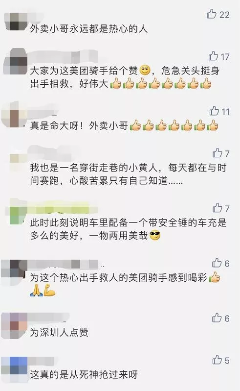 视频中,一名外卖小哥和一名环卫工正在砸车窗,此时车已经淹没在水中,快漫上车窗。记者了解到,该视频发生在上周末,深圳暴雨中一名开着奔驰车的司机被困路上,已经出现缺氧情况,幸得路过的外卖小哥出手救人。