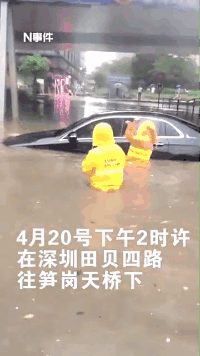 连日暴雨袭城,4月20日下午2时许,一深圳市民开车行驶到田贝四路往笋岗天桥下时,车已经有大半被水浸没。