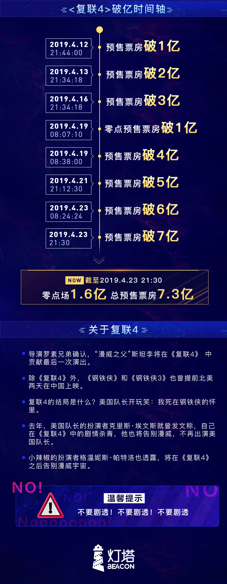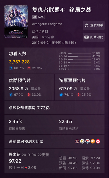 深圳新闻网4月24日讯(记者 陈婕)相信你的朋友圈已经被“复联4”占据了领地,而小记认识的英雄还凑不齐一桌麻将。截至24日00点,《复仇者联盟4》预售已破7亿!超《美国队长2》总票房,在《复联4》的预售峰值期,淘票票预售市场占比过半。
