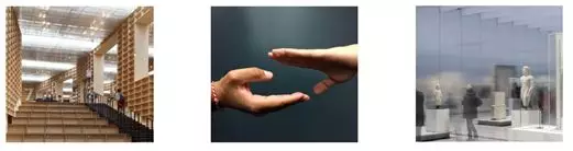 在外部观看这两座建筑,像是上下合并的双手,在两座建筑中间创造出了不同层次的公共平台,南侧入口广场拾级而上进入到第二图书馆前的广场,其上预留丰富的空间意向,图书市场、阅读、散步、展览、演讲……而这个广场又与美术馆前的地面庭院巧妙相连,在大雨蓬的覆盖下,是美术馆的户外雕塑广场;它们为城市提供了公共空间并承接着城市的轴线。平台扩充了建筑的功能,抬高的空间使它远离城市的喧嚣,其上悬挑的屋盖为其提供了庇护,营造出了舒适的氛围。