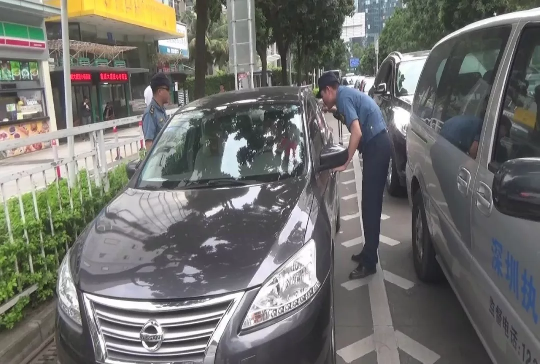 执法人员例行对车牌号为粤BT***的小轿车进行检查,司机将车窗降下,缓缓驶入待检区域。