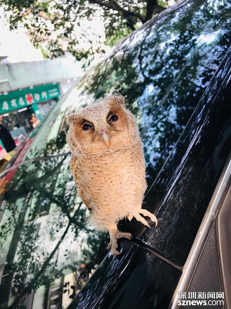 深圳新闻网2019年4月25日讯(记者 郑晓鹏)今日早上8点多,一只小猫头鹰停留在莲花北村小区一辆小汽车上,路过的市民纷纷围观拍照。