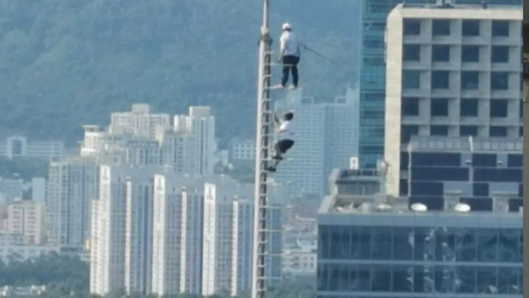 这段视频拍摄于昨天上午9点左右,视频拍摄者李先生表示,当时他正在公司值班,往窗外一看,却发现对面的信息枢纽大厦塔顶,靠近中国电信招牌的位置有动静,定睛一看,居然是两个人在塔顶的铁杆上游走。