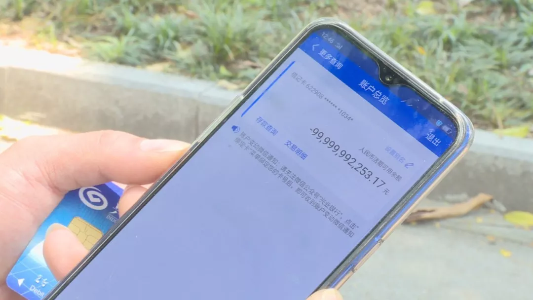 杨先生在今年2月中旬,经朋友介绍来到深圳坪山工作,公司统一办理了兴业银行的工资卡。杨先生说,第一个月发工资时,他就发现工资取不出来,就以为是银行卡没激活,没在意。可是当第4月份的工资也用不了时,杨先生赶紧下载了手机银行,这一查,吓了一跳!账户余额显示:-99,999,992,253.17 (负999亿余元)。