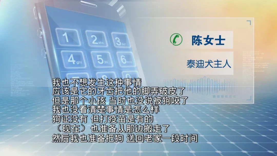 今天早上,城管部门也前往了小区了解情况,但涉事的狗主陈女士并不在家。记者随后电话联系到上陈女士,对方表示,这只泰迪犬她已经养了两年,每年都有去注射狂犬疫苗。