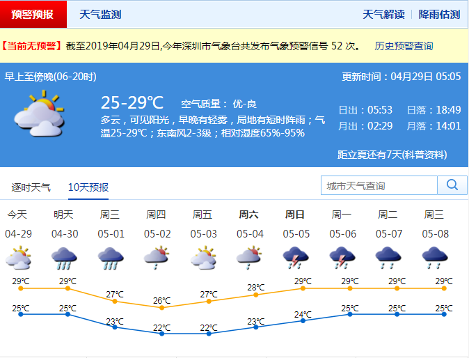市气象台预测,“五一”假期其余时间(2-4日)多云为主,可见阳光,间中有短时阵雨,其中2-3日沿海和高地东风强劲,最大阵风8级左右。市气象台提醒市民,深圳已进入强对流天气多发期,需留意最新预警预报信息,注意提前防范局地短时强降雨、雷雨大风和冰雹造成的灾害,远离户外广告牌、临时建筑、低洼地和涵洞等排水不畅地区。