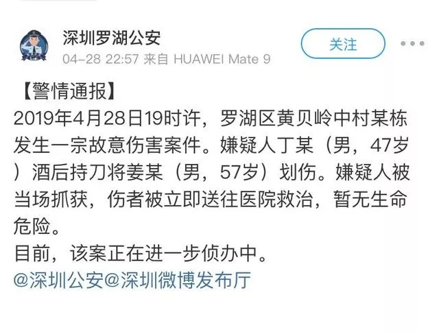 据记者了解,嫌疑人被当场抓获,伤者被立即送往医院救治暂无生命危险。罗湖公安也发布了警情通报,行凶者是酒后持刀伤人,警方通报如下:
