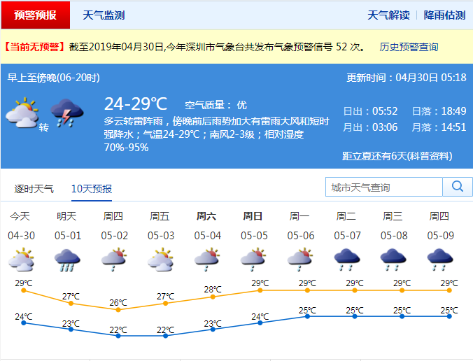 深圳新闻网2019年4月30日讯 记者从市气象局了解到,受冷空气、高空槽和切变线的共同影响,30日至5月1日有一次明显降雨伴强对流天气过程,强对流天气可能对30日下班、放学时段造成严重影响,且恰逢五一假期出行高峰期,市民请合理安排出行并注意交通安全,远离低洼易涝、危险边坡等区域,尽量避免沿海和海上活动。