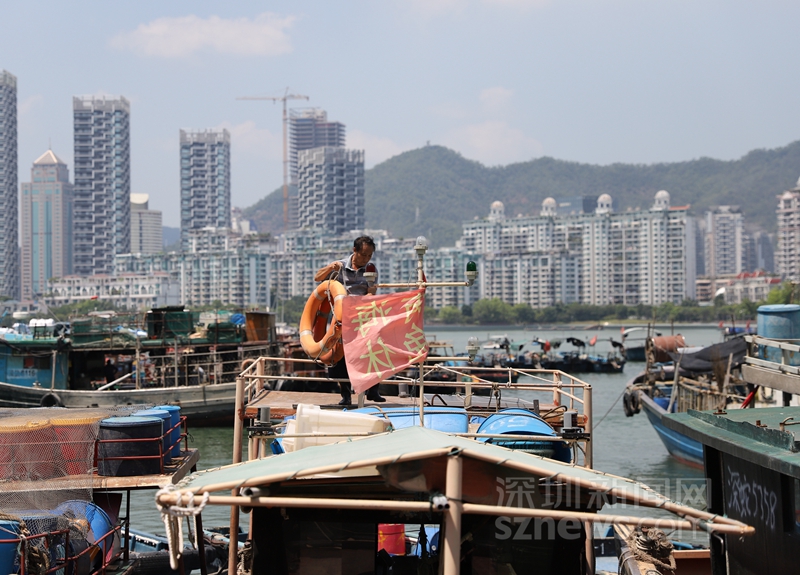 16时,深圳渔民回港口后整理船上的救生圈(杨浩翰 摄)