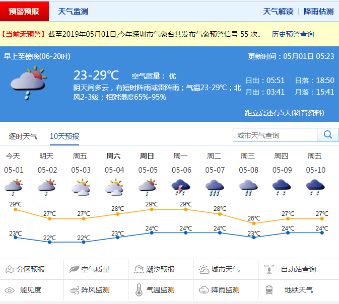 深圳新闻网2019年5月1日讯 深圳市气象局预计1日阴天间多云,有阵雨或雷阵雨,23-29℃;2-6日多云为主,间中有短时阵雨,其中2-3日沿海、高地和海区有7-8级偏东风。
