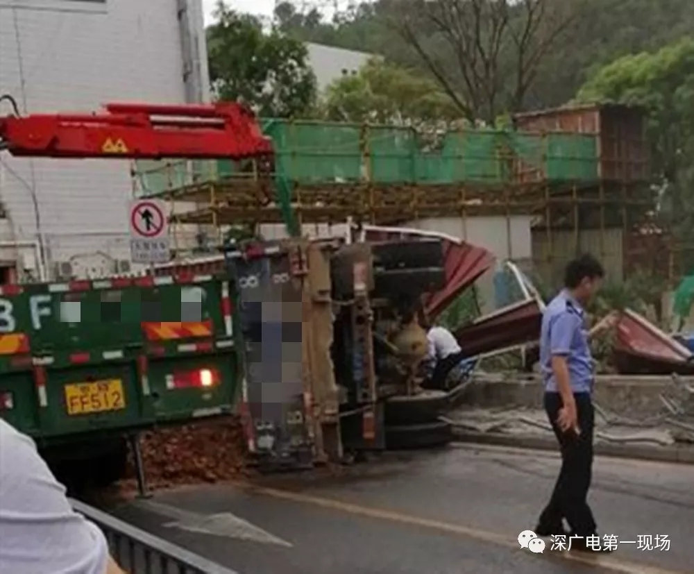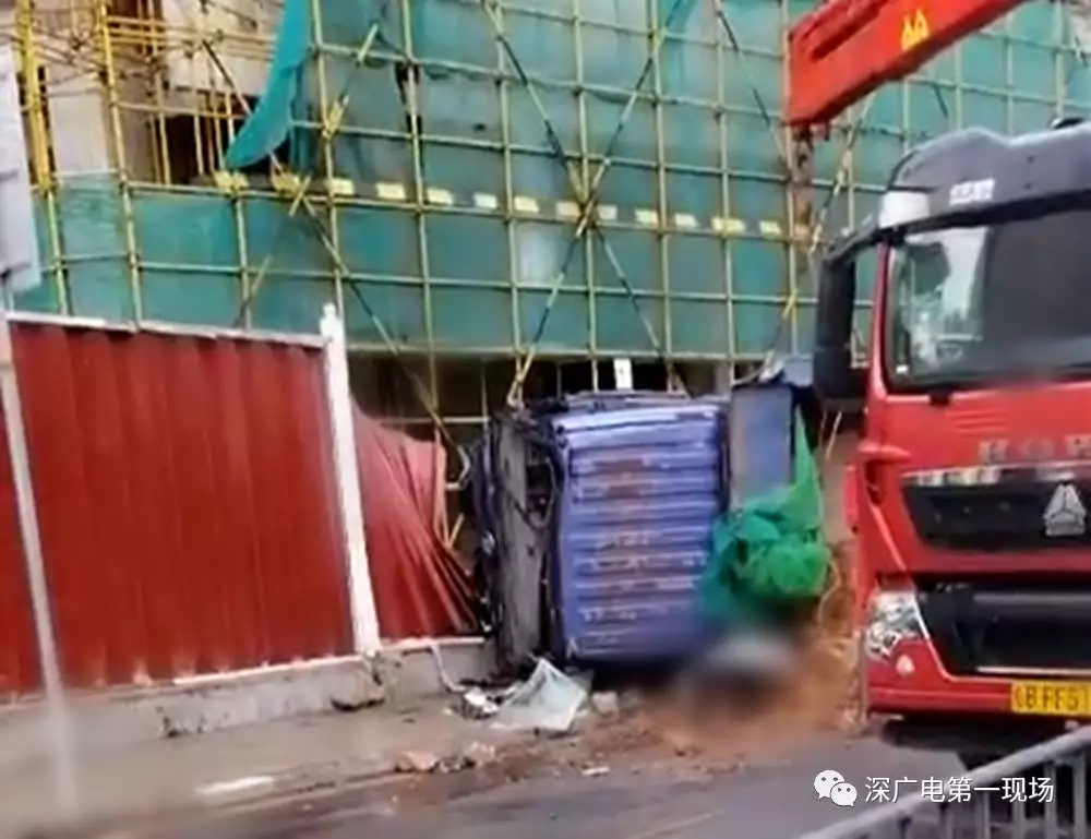 深广电第一现场2019年5月5日讯 4日下午5点左右有观众在粉丝群爆料称在深圳罗湖金湖路上从观众提供的现场视频可以看到这辆渣土车的车头已经严重变形。