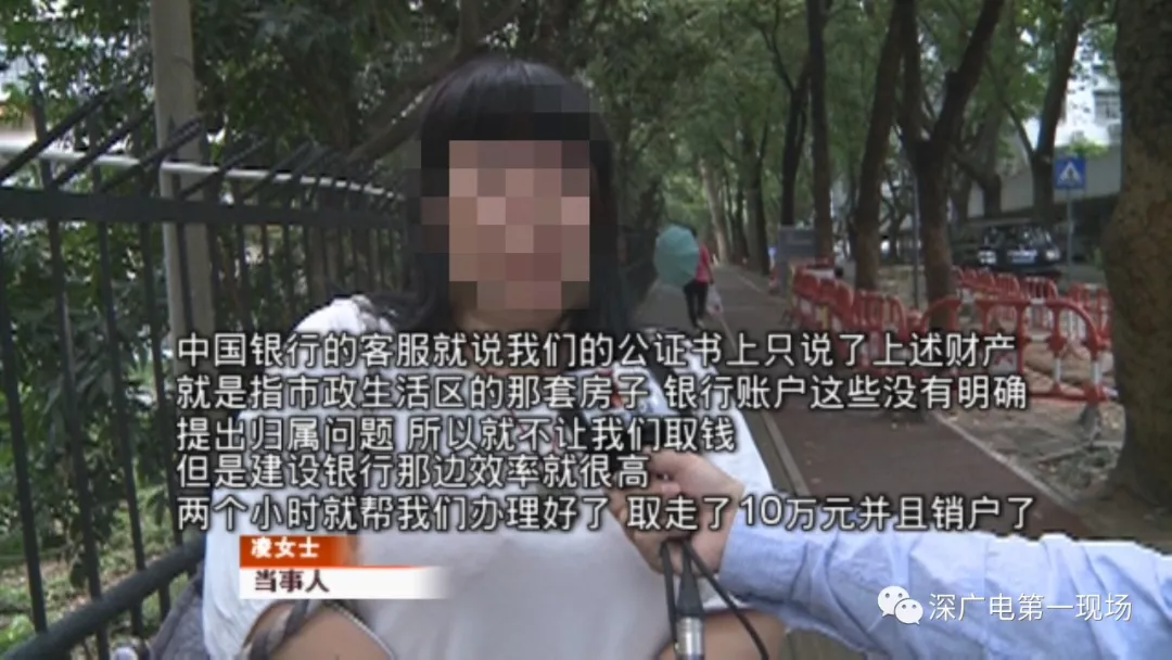 建设银行账户的10万元,凌女士和婆婆周女士拿着相关资料,顺利取款并做了销户处理。但是她们去到中国银行福田支行时,却被银行柜台以公证书中未明确银行账户归属为由,拒绝办理取款销户业务。