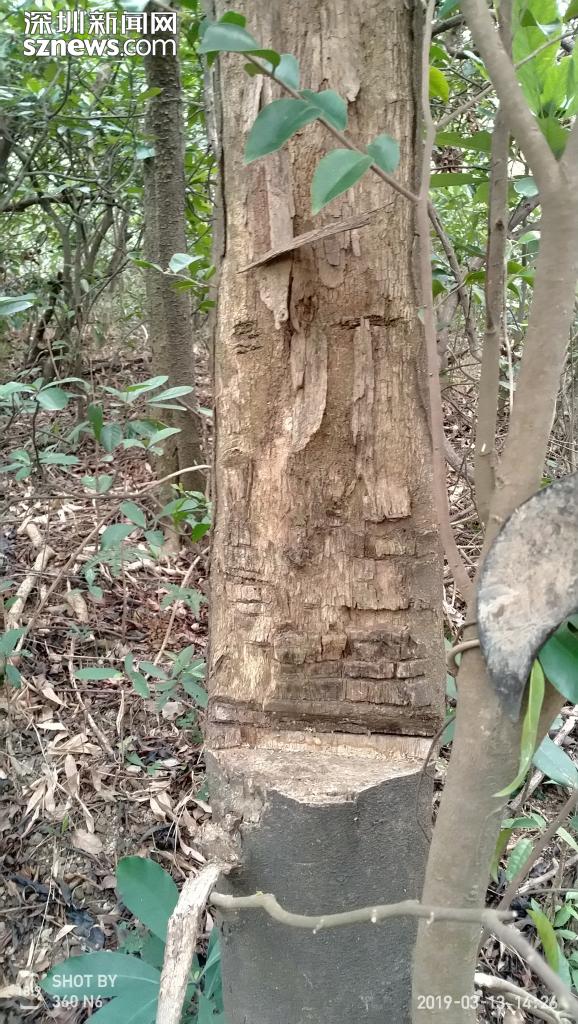 该网友提及的应人石村位于深圳石岩,从地图上看,其“后山”与羊台山森林公园连为一体,是附近居民闲暇时度假踏青的重要选择。据了解,网友“诗奴L”于今年3月中旬上山游玩,游玩途中发现原本茂盛的野生沉香树大多遭人砍伐。“不法分子穷尽一切手段,用钻、削、劈、锯等来对沉香树进行摧残,这简直是屠杀式的洗劫!”该网友表示,看到这么多野生沉香树被残暴砍伐,真地让人很气愤。