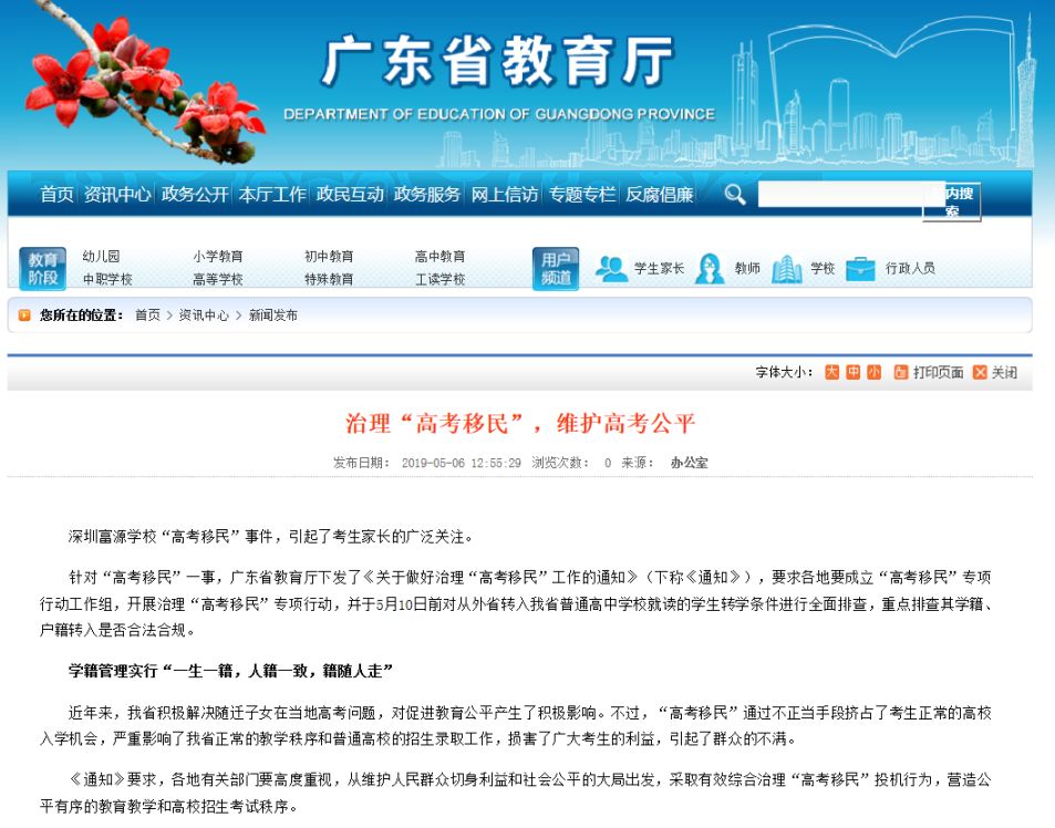 与以往高考移民的个案不同的是,此次广东深圳富源学校的高考移民,有明显的学校主导推动的痕迹,可以说是“组团”高考移民。