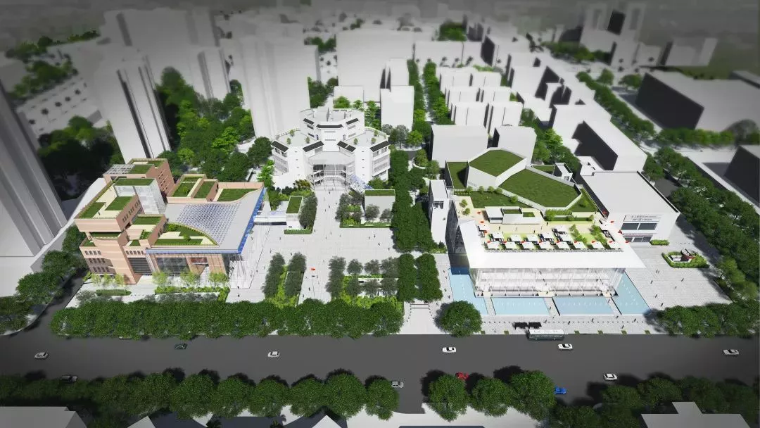 由原群众艺术馆、影剧院和图书馆组成,建成后群众艺术馆将更名为文化馆,影剧院更名为音乐厅,图书馆和文化广场的名称则保持不变。