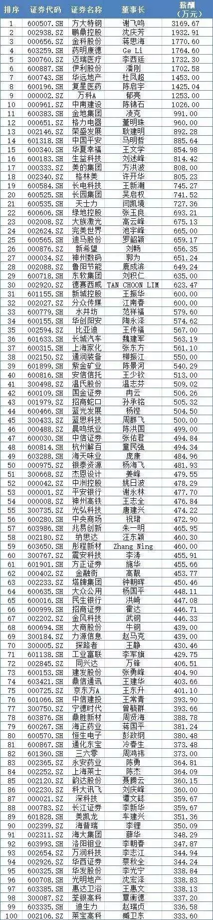 2018年A股上市公司董事长年薪在500万以上的有44位,1000万以上的有10位。其中,2018年A股上市公司薪酬最高的为方大特钢董事长谢飞鸣,年薪为3169.67万元。莱宝高科董事长以333.60正好跻身第100名。