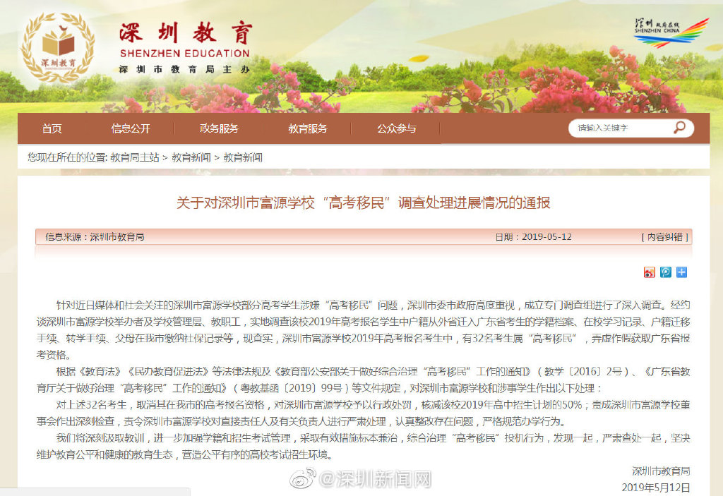 深圳教育局公布富源学校事件调查结果:该校32名“高考移民”全部取消报名资格。