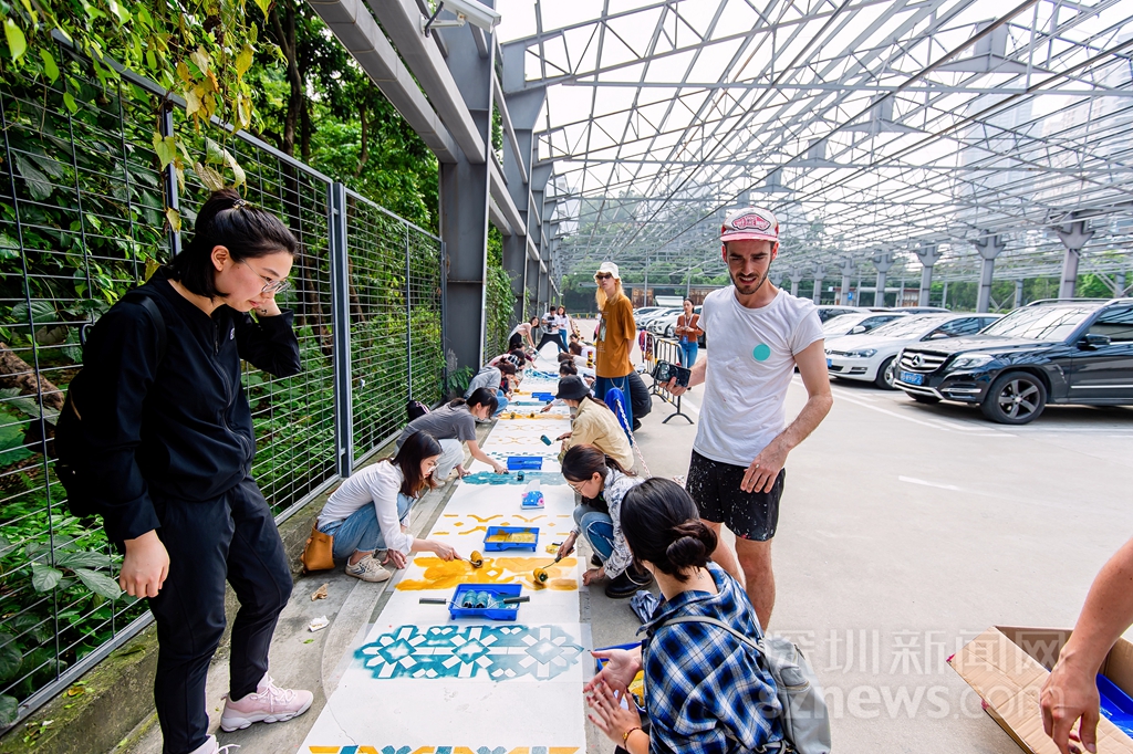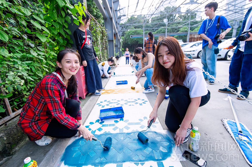 志愿者在协助创作《安全地带》花砖涂鸦作品(主办方供图)