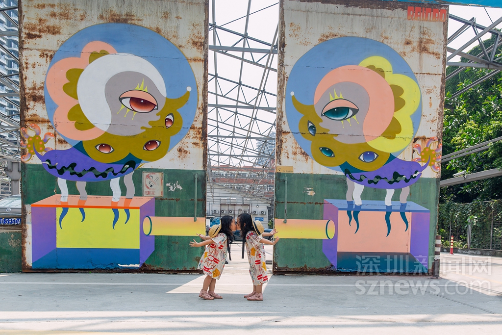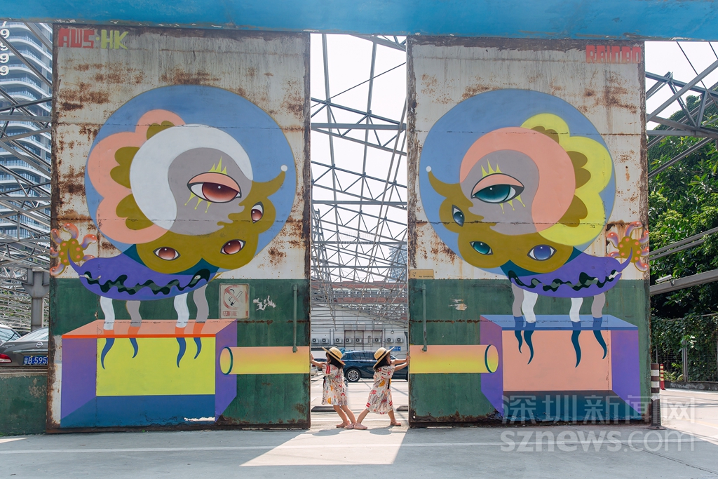 在城市公共空间中,涂鸦艺术不仅是一种重要的人文景观,同时还能给人一种视觉享受,使单一的生活变得富有色彩。来自中国香港的全职艺术家彭怡擅长用涂鸦进行故事创作,带来作品《双观》,以左右对称相望的停车场守护神的形象感染车主与行人,传达平稳冷静的力量。