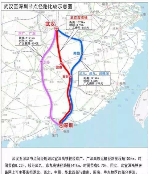 据了解,为了分流日益饱和的京广高铁客流,湖北提出拟在武汉和深圳之间建设一条高铁。武深高铁大致走向为:武汉 -咸宁 -修水 -铜鼓 -宜丰 -万载 -宜春 -安福 -井冈山 -遂川 -赣州 -深圳。一旦建成,将形成武汉到深圳的一条笔直线路。初步预测分析,新规划的武汉至深圳高速铁路,较经京广、广深高铁运输径路里程短100多公里,时间节省20分钟;较经武九、京九高铁径路短141公里,时间节省42分钟。
