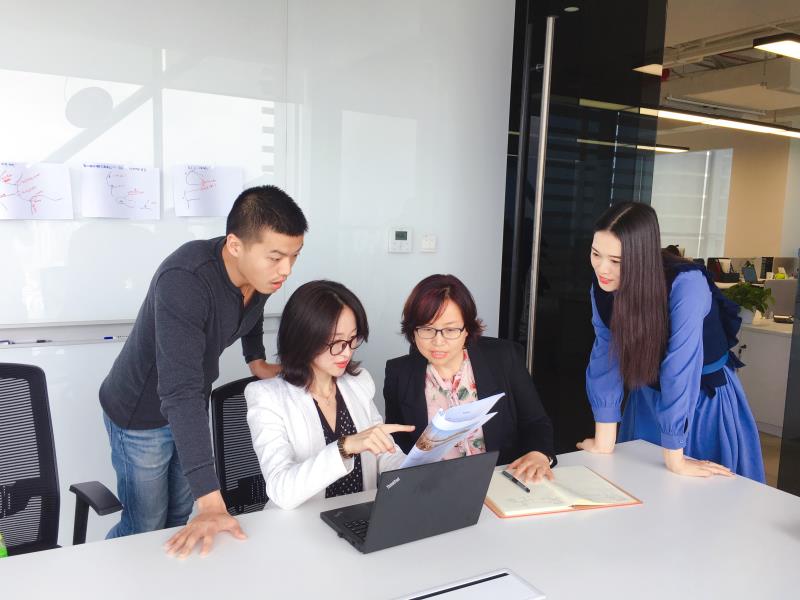 杨春梅和同事一起探讨设计方案修改