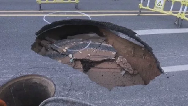 记者在现场看到,海德一道靠近后海滨路的道路中间形成了一个大坑, 坑内还有不少污水,发出阵阵恶臭味 。