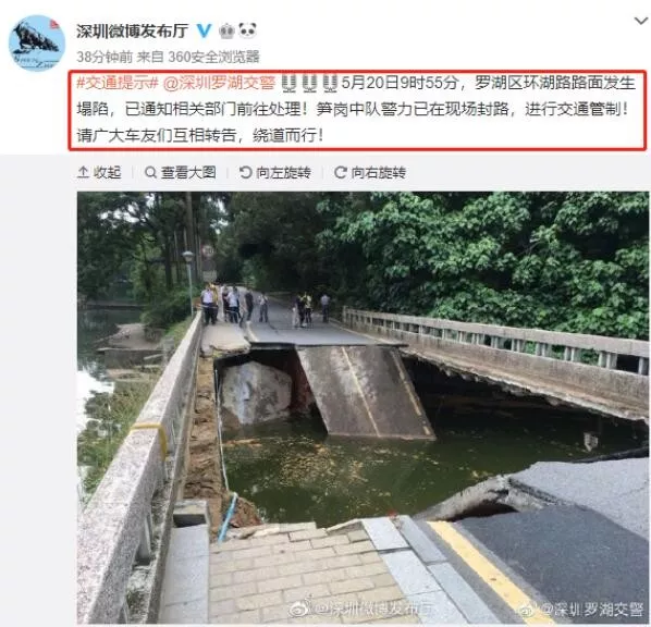 紧急提醒!罗湖环湖路路面发生塌陷,正封路进行交通管制