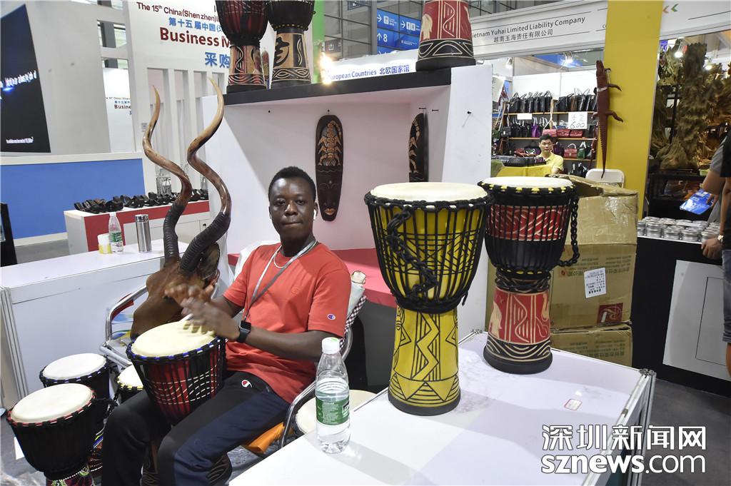 肯尼亚展区中,一位外籍表演人员正在表演非洲手鼓