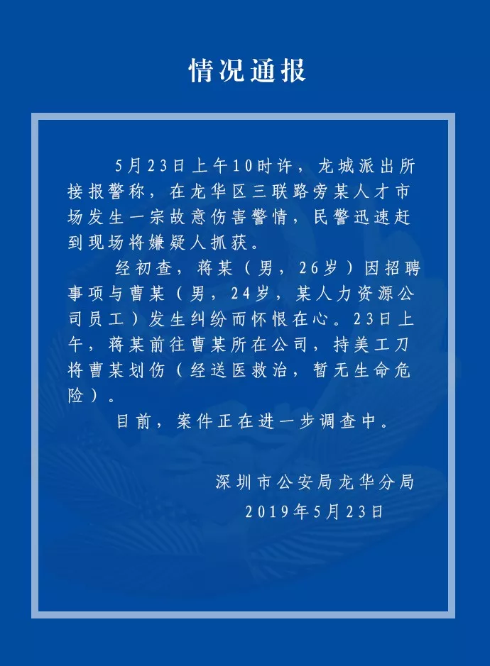 据警方通报,嫌疑人蒋某因招聘事项与某人力资源公司员工曹某发生纠纷,怀恨在心。23日上午,蒋某前往曹某所在公司,持美工刀将曹某划伤。经送医救治,暂无生命危险,目前案件进一步调查当中。