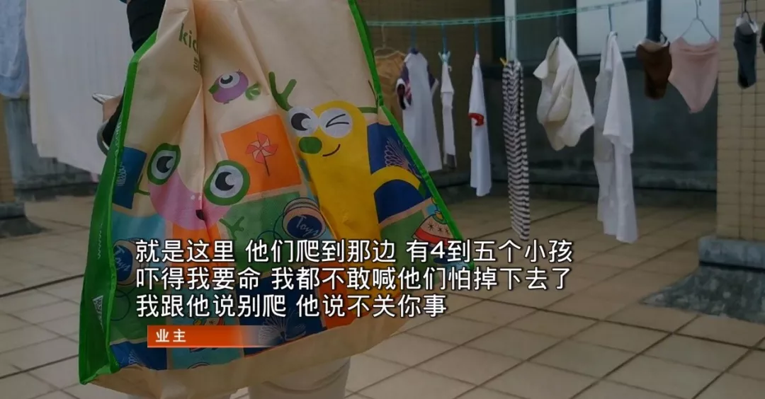 就在上周六,她亲眼看到四五个孩子在天台上四处攀爬,玩枪战,拦都拦不住。