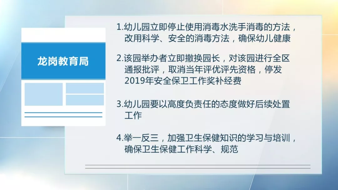 5月24日,龙岗区教育局了解到该情况后,立即派工作人员到幼儿园进行调查。经查,该园出现“疱疹性咽颊炎”后,违规使用强力消毒粉兑水给幼儿洗手消毒,存在卫生保健上严重错误。