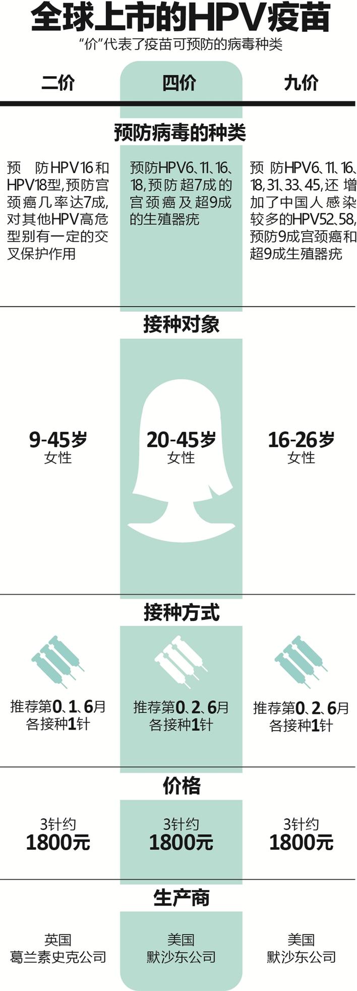 目前,国际上广泛使用的 HPV疫苗有3种,分别为二价、四价、九价HPV。深圳每针HPV九价疫苗的价格为1323元,加上每针25元的注射费,三针下来总花费在4000出头。不过与香港HPV九价疫苗规定“9岁或以上之女性及男性(没年龄上限)”均可接种不同,深圳HPV九价疫苗的摇号年龄限定为16-26.5岁的女性。据了解,在理想情况下,疫苗应该在首次性行为(即暴露于HPV感染危险)之前给予。年龄越大的女性因有性行为增大了HPV病毒感染的几率,而HPV疫苗对于已感染的HPV病毒无治疗作用,只能预防未感染的HPV病毒,因此疫苗免疫会比未感染病毒的女性低。