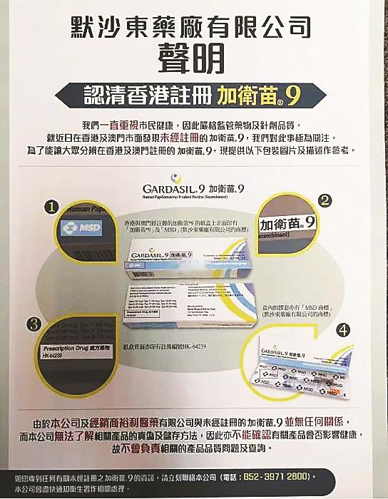 早前,HPV(全称人乳头状瘤病毒)九价疫苗生产商默沙东药厂曾发出声明,把其公司指定的代理商,从未供应任何“HPV九价预防疫苗”(GARDASIL9加卫苗9)予位于佐敦嘉宾商业大厦的环亚体检集团(最早被投诉给内地客人打水货疫苗的公司)。