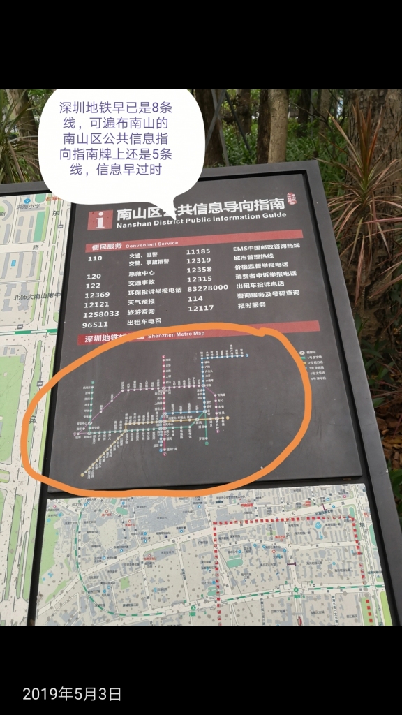 事实上,深圳新闻网记者早在2018年8月24日就已报道过此事,时隔9个月,“南山公共信息导向指南”更新不及时一事却再次被提起。是时间不够还是效率不高?一个区域的公共信息导向指南更换了近一年无进展,还需要公众给予多少时间、多少包容呢?网友可以理解,也希望不要再等9个月了。(此前报道:请更新过时的“南山区公共信息指南”!深圳地铁线已有8条了!)