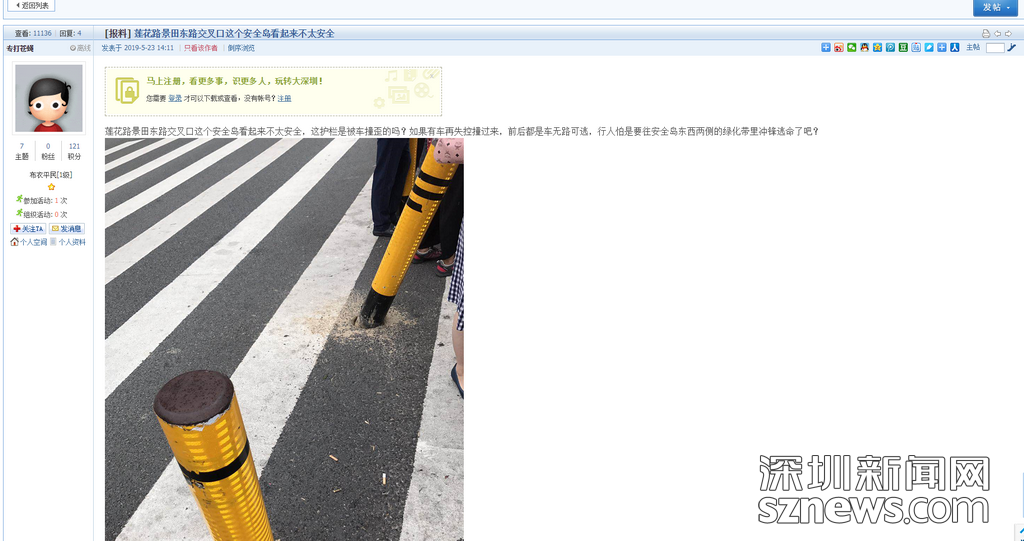 深圳新闻网2019年5月29日讯(记者 刘婷)“莲花路景田东路交叉口这个安全岛看起来不太安全。”近日,网友“专打苍蝇”在深圳论坛爆料称,莲花路景田东路交叉口安全岛警示桩受损,存在安全隐患。5月29日,记者来到该路段实地勘察,发现安全岛受损警示桩已全部整改。 (原帖文:莲花路景田东路交叉口这个安全岛看起来不太安全)