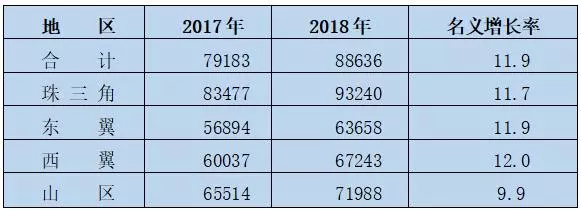城镇非私营单位的排名则为珠三角、山区、西翼、东翼,分别是93240元、71988元、67243元和63658元;同比名义增长率从高到低依次为西翼12.0%、东翼11.9%、珠三角11.7%和山区9.9%。最高和最低区域的平均工资之比为1.46,比上年缩小0.01。