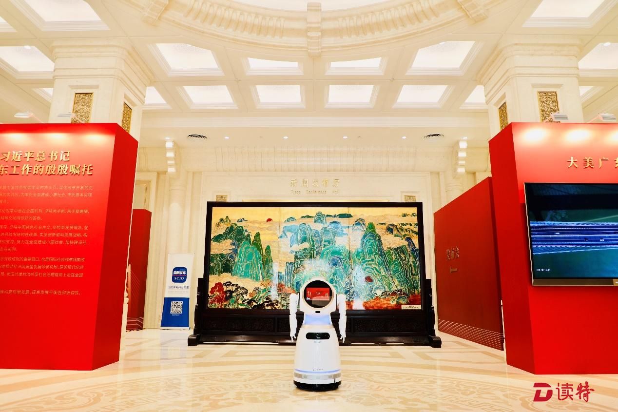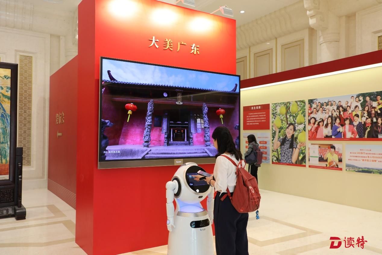 新中国成立70周年广东省成果展入口处克鲁泽提供智能迎宾服务。