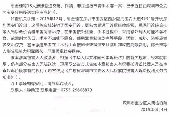 最近,宝安区人民检察院就发布了一起案件公告,当中显示宝安区西乡鹏深门诊在病患接受检查、手术治疗过程中,为获取不法利益,采用“恶意夸大病情、故意割大伤口及使用器具制造疼痛”等手段,诱骗、威胁、恐吓患者多交治疗费,近日鹏深门诊18人被起诉。