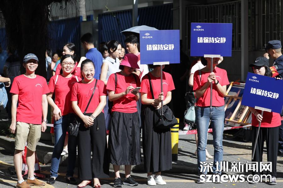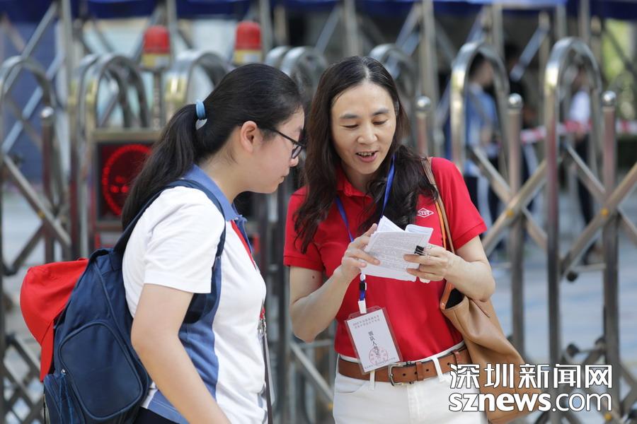 深圳实验中学老师等待在考点外,为学生发放准考证
