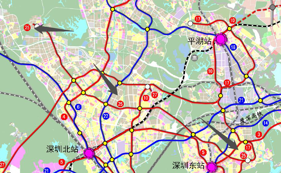 根据《深圳市城市轨道线网规划(2016-2030)》,25号线定位为支撑深圳市北部发展带的普速服务线。线路联系龙华、坂田、布吉等横向二圈层片区,增加沿线片区的轨道覆盖率,加强横向联系,同时与5条纵向轨道快、干线换乘,喂给客流,完善轨道线网结构。