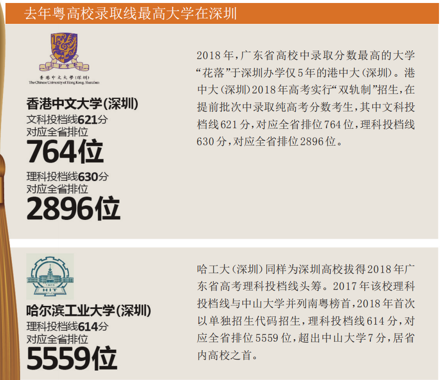 哈工大(深圳)同样为深圳高校拔得2018年广东省高考理科投档线头筹。2017年该校理科投档线与中山大学并列南粤榜首,2018年首次以单独招生代码招生,理科投档线614分,对应全省排位5559位,超出中山大学7分,居省内高校之首。