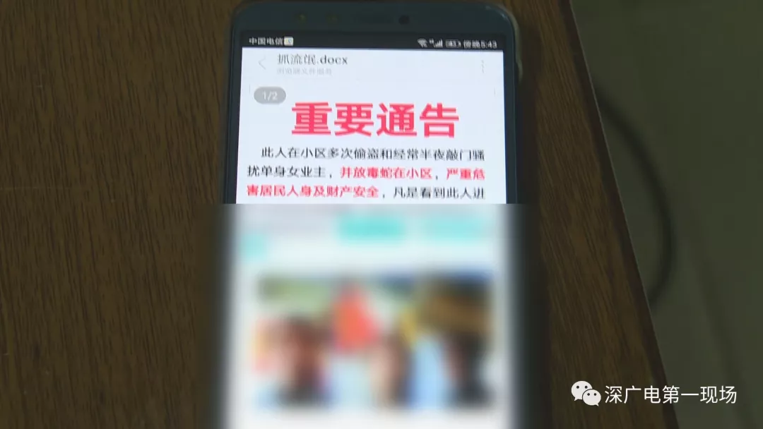 ▲小区通报全体业主的告示,提醒住户要堤防闹事男子。