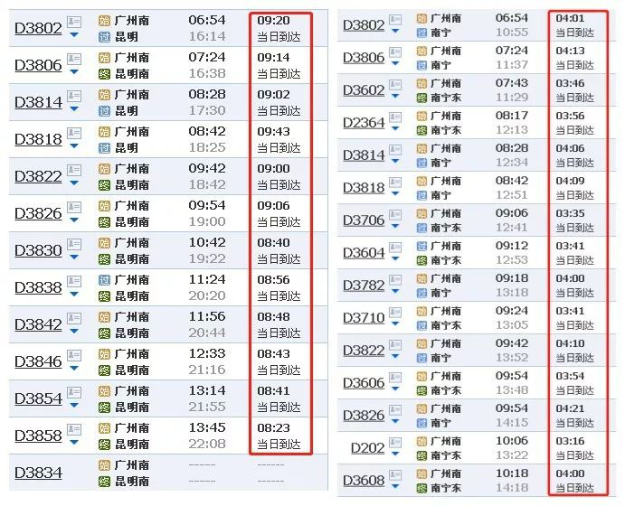 深圳前往昆明、南宁的车次少得可怜,但从广州去的多呀!