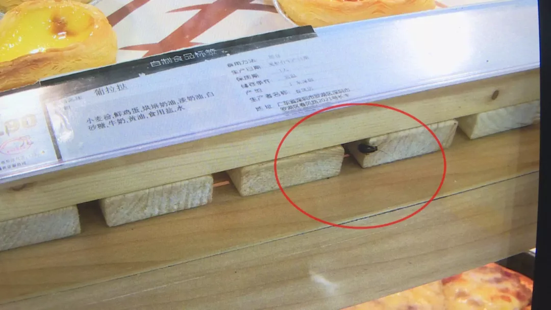 李女士说,在超市的面包柜台里,有小蟑螂在围着面包四处爬。为了核实李女士的说法,今天上午10点,记者前往了罗湖区春风路的华润万家。刚在柜前站了一会,记者就注意到这柜里的蛋挞上,有个黑点,镜头拉近,才发现是一只蟑螂!正在上面大饱口福!